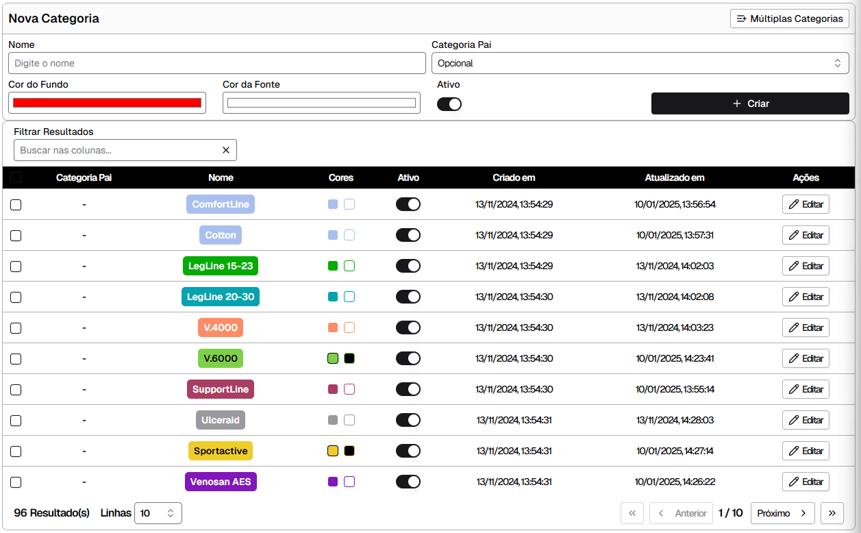 - Colunas: Categoria Pai, Nome (com rótulo colorido), Cores (pré-visualização), Ativo, Criado em, Atualizado em, Ações.