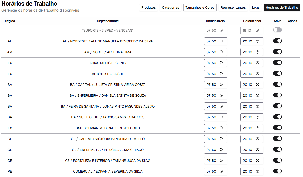 Esta é a página de gerenciamento de horários de trabalho do sistema.