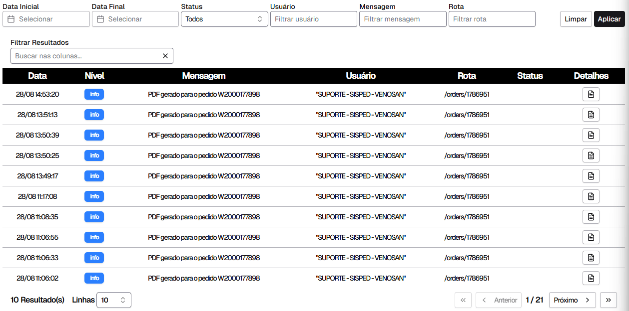 | Data | Nível | Mensagem | Usuário | Rota | Status |